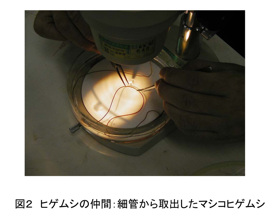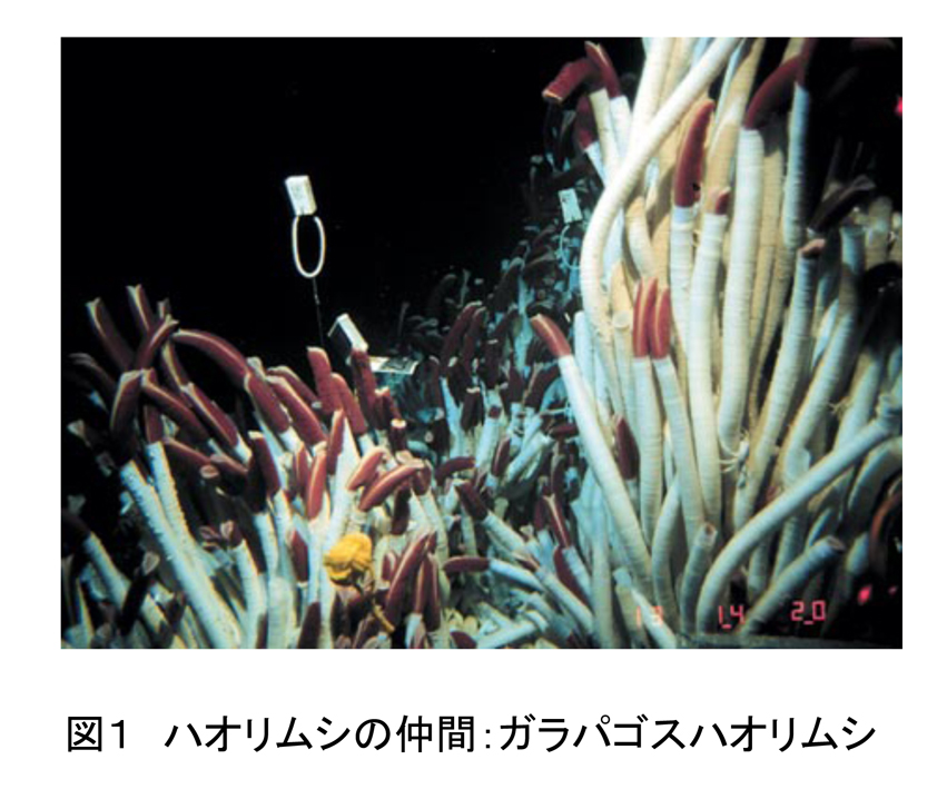 有鬚動物とは、口・肛門・消化管が無く細長い触手を頭部に持つ左右対称の真体腔動物のことであり、環形動物の仲間である。例えば、ガラパゴス沖の深海(水深約1500〜2500m)の熱水噴出口付近に棲息するRiftia pachyptila(図1:ガラパゴスハオリムシ)は長さ2〜3mに達する大きな動物であるが、口も肛門も消化管も無い。また、石川県能登半島九十九湾の水深約25mに棲息するOligobrachia mashikoi(図2:マシコヒゲムシ)も有鬚動物であり、その大きさは体幅1mm以下、長さ10~30cmの“髪の毛”のような動物である。それでは、このような口・肛門・消化管を持たない動物はどのような方法で生きるための食物を獲得し、エネルギーを獲得ているのだろうか?一般的には、「有鬚動物は栄養体と呼ばれる組織にイオウ酸化細菌(化学合成細菌)等を細胞内共生させ、宿主は共生するイオウ酸化細菌(化学合成細菌)が炭酸固定によりつくりだした有機物(あるいは、リソソームにより消化された共生細菌)を食物(エネルギー源)として利用している。」と考えられている。すなわち、有鬚動物にとって、細胞内共生細菌が「命の源」であり、ガラパゴスハオリムシは暗黒の世界でも生きることができる。