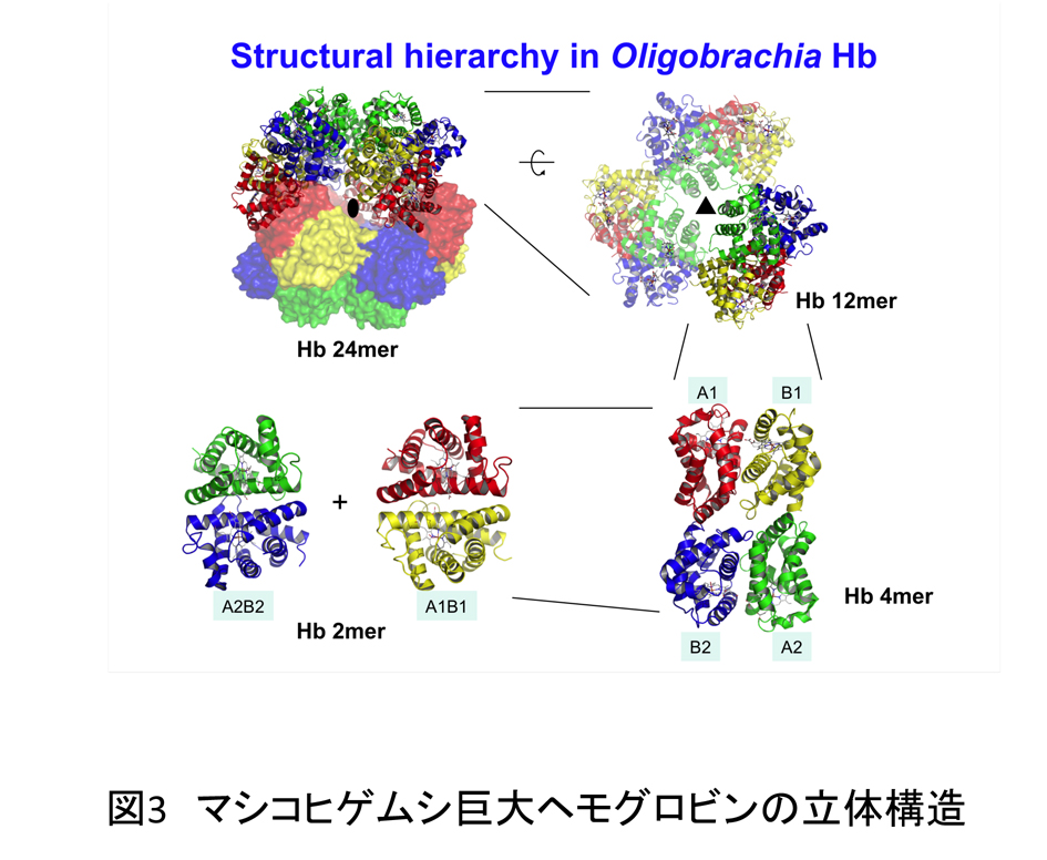 私たちは、有鬚動物マシコヒゲムシと鹿児島湾に棲息する有鬚動物Lameribrachia satsuma(サツマハオリムシ)の巨大ヘモグロビンの“働き”を分子レベルで解明すること取り組んでいる。そのために、先ず、これら巨大ヘモグロビンの立体構造の解明に取り組んだ。その結果、2005年に京都大学大学院理学研究科三木邦夫教授グループとの共同研究によりマシコヒゲムシ巨大ヘモグロビンの立体構造を解明することに成功した(論文1,2,3)。その後、私たちは、京大グループと法政大学工学部今井清博教授グループとともに、巨大ヘモグロビンの酸素協同性に関する新しい知見を得た(論文4,5)。以下にこれまでの私たちの研究で明らかにされたマシコヒゲムシ巨大ヘモグロビンの構造機能相関について概説する。詳細については、各論文を参照いただきたい。