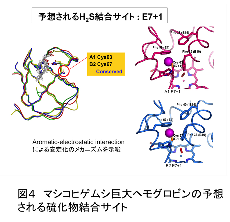 マシコヒゲムシ巨大ヘモグロビンに硫化物が結合することは、定量的な実験から明らかとなっている(論文3)。その際、ヘモグロビンの分光学的性質に変化は無い。このことは、硫化物はヘムには結合せず、蛋白質に結合していることを強く示唆する。それでは、どのアミノ酸に結合しているだろうか?これまでの研究より,硫化物を結合する機構として,フリーのシステイン残基の関与が提唱されていた。これらのシステイン残基は硫化物を結合する巨大ヘモグロビンを持つ,近縁の種間で保存されている。また、マシコヒゲムシ巨大ヘモグロビ ンの水銀化合物置換体の結晶構造中,硫化水素結合部位と提案されていたシステイン残基の全てについて,水銀化合物が結合していた。これらの実験結果は、硫化物がこのシステイン残基のイオウ原子と共有結合している可能性を強く示唆する。さらに、興味あることに、このシステイン残基の周囲はフェニルアラニンに囲まれており、硫化物結合に際して、aromatic-electrostatic interaction による安定化が推測されている(論文3)。巨大ヘモグロビンの硫化物結合部位を同定するためには、硫化物結合型の立体構造の解明がもっとも信頼できるデータだと思われるが、残念ながら、未だ、硫化物結合型ヘモグロビンの結晶の調製に成功していない。